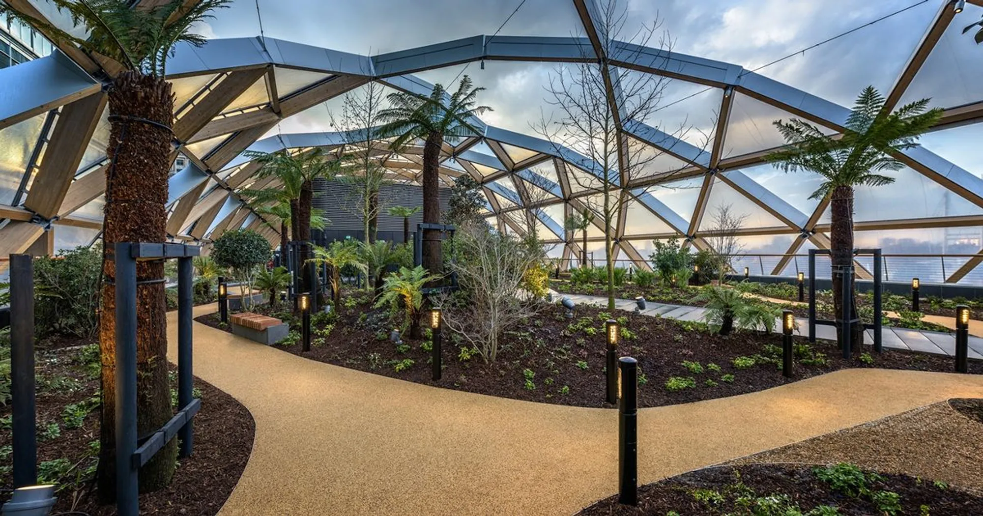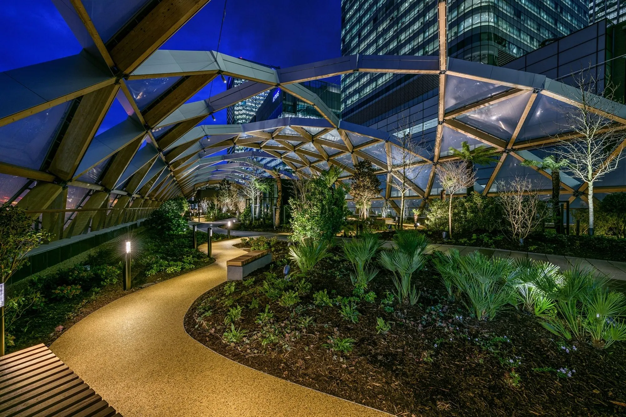 Crossrail’s roof garden at Canary Wharf station sits two storeys above the waters of the North Dock of West India Quay. British architecture firm Foster + Partners designed the roof structure and cladding that houses the station’s leisure complex. Beneath the 310-metre hood style roof is the garden, featuring a number of exotic plants. Landscape architecture firm Gillespies, which previously designed the sloping garden at 20 Fenchurch Street, was chosen to lead the project.