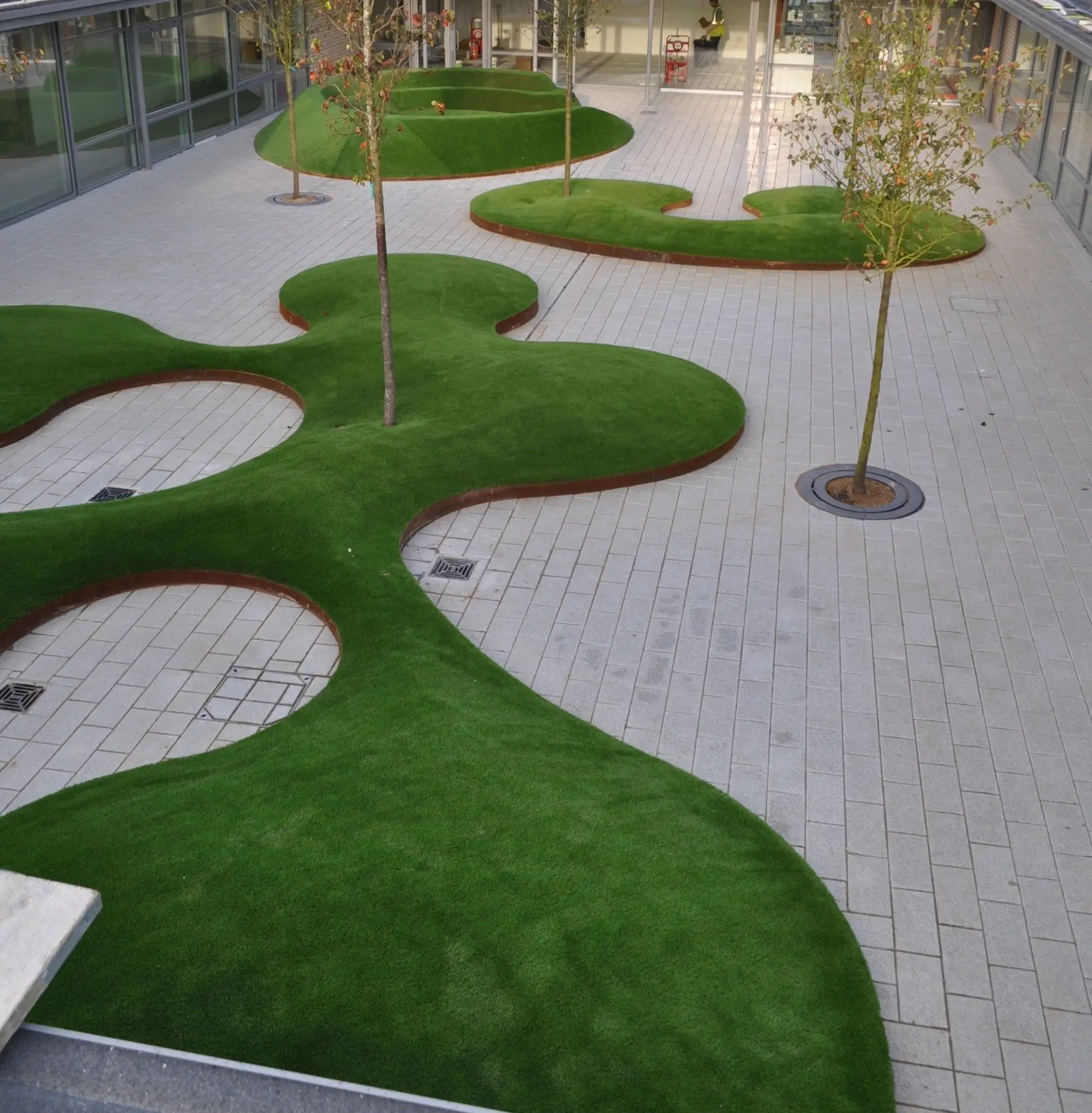The unique shapes designed by the architect were achieved by utilising the pre-forming service offered by Kinley systems on our Kinley range. The CorTen steel provides a durable and pleasing finish. The Urban steel edging was used to create a clean and crisp edge to the outer edge of the rubber play surfacing. Kinley has supplied steel landscape edging and pre-formed its Urban CorTen steel landscape edging to provide bespoke profiles between paving, synthetic turf, planting and play areas at the new Endeavour Primary School development in Andover, Hampshire. The architects at Hampshire County Council had designed an intricate landscape tableau that could only be achieved by utilising the pre-forming service offered by Kinley. Using Urban ensured that the creative outlines required could be easily installed as well as providing a distinctive and durable CorTen steel finish. Fabricating and pre-forming Urban off-site made installation by contactors Aeropark Developments quick and straightforward. Buyer, Bob Cropper, said: “From the very first contact I found Kinley Systems to be extremely helpful and efficient. The Urban CorTen edging was quite complex in design but installation on site could not have been easier as each section was colour coded and numbered. ”Kinley's Urban steel landscape edging is a heavy duty, premium product, perfect for prestigious projects requiring maximum strength and durability. Making a clear definition of surface materials and preventing migration of gravel and soil, Urban will stay in place and serve its purpose for decades, saving many hours of maintenance. Kinley's steel profiles were additionally used to produce a clean and crisp delineation to the outer edge of the rubber play surfacing, creating a safe environment in which Endeavour School’s 200 pupils can learn and have fun. Colin Lord added: “Urban was chosen to provide the only cost effective, quick and invisible junction between the highly complex paving outline and the artificial grass edge adjacent to it. Setting up this curved outline with Urban proved ideal for making the fine adjustments necessary. Aeropark Developments worked with me to make the best use of this flexible, easy to install product.” Urban steel landscape profiles provides the ultimate commercial edging solution for hard surfaces, whether it be asphalt, resin bonded or loose gravel, blocks, bricks or paving slabs. Steel is tough, lightweight, flexible and 100% recyclable, making it a popular choice with specifiers and contractors alike.